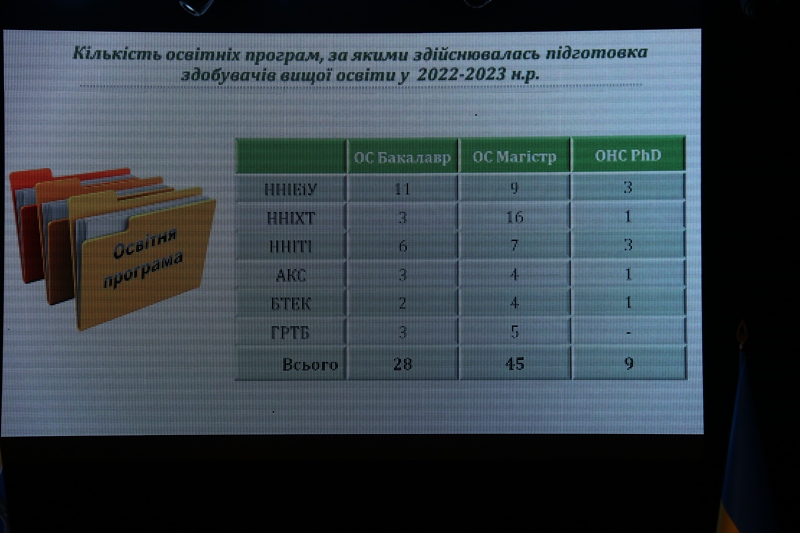 У ході доповіді ректор детально розглянув питання акредитації освітніх програм (у минулому навчальному році університет успішно акредитував 38 освітніх програм, у 2023-2024 н. р. заплановано до акредитації ще 7), ґрунтовно проаналізував формування контингенту студентів, розповів про освітню діяльність під час дії воєнного стану, автоматизовану систему управління освітнім процесом, приділив увагу міждисциплінарним освітнім програмам, дуальній освіті, академічній етиці та доброчесності, англійській мові у навчальному процесі, основним процедурам і заходам внутрішньої системи забезпечення якості освіти, надав детальний аналіз наукової, інноваційної та  міжнародної діяльності університету, навів дані про місце університету у цьогорічних рейтингах (ТОП-200, консолідованому, за місцем у Scopus, Webometrics Ranking of World's Universities тощо). Також у виступі очільника університету йшлося про академічну мобільність наших викладачів і здобувачів освіти, роботу з кращими здобувачами щодо формування їх індивідуальної освітньої траєкторії, сертифікатні програми НУХТ, роботу психологів і виховну роботу, спортивно-масову роботу, інформаційне забезпечення освітньо-наукової діяльності, працевлаштування випускників та результати їх анкетування, співпрацю зі стейкхолдерами, кроки, здійснені в напрямку зміни змісту освітніх програм аби вони відповідали вимогам сьогодення, очікуванням здобувачів і потребам роботодавців. Крім того, присутні отримали вичерпну інформацію щодо стану й використання матеріально-технічної бази університету, виконаних капітальних і поточних ремонтів, надходжень і видатків загального і спеціального фондів. Окремо ректор проінформував щодо облаштування та функціонування із забезпеченням всім необхідним найпростіших укриттів у навчальних корпусах і гуртожитках, місткістю відповідно 3322 та 2599 місць. Крім того, безперебійно працюють пожежна сигналізація, система сповіщення про пожежу та була встановлена додатково система «Повітряна тривога».