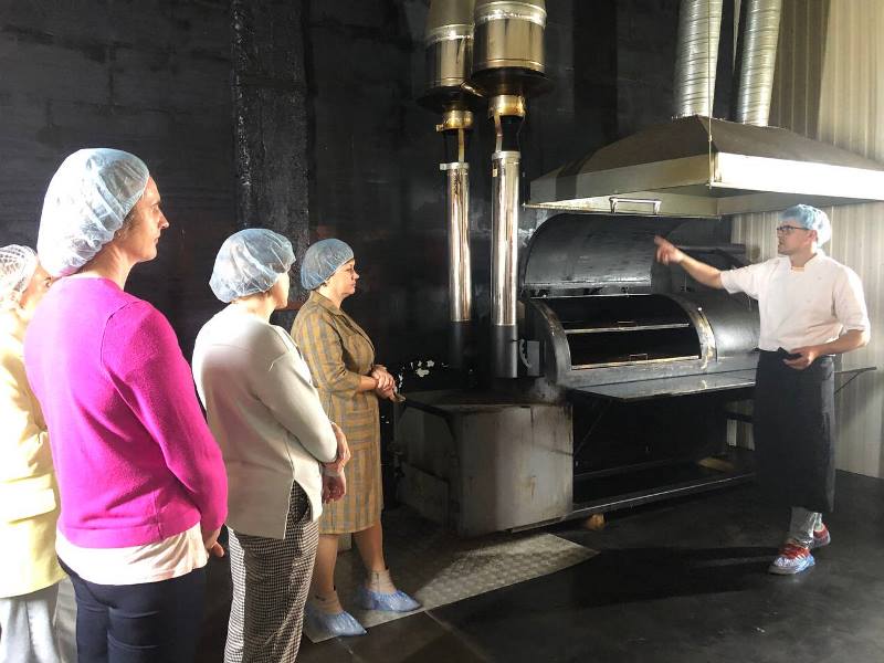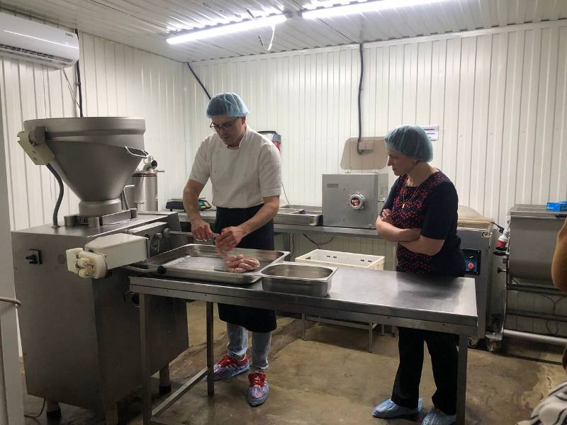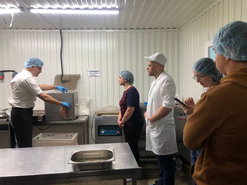 У рамках відвідування ТОВ «М'ясоріг» вони оглянули виробничі приміщення підприємства та технологічне обладнання, задіяне на етапах приймання сировини → підготовки м’ясної сировини (у вакуумному масажері) → подрібнення (в кутері) та заправлення спеціями → термічному обробленні та охолодженні → пакуванні та зберіганні.