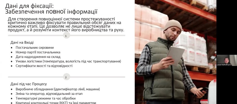 Лектор детально розкрив роль системи простежуваності як одного з ключових інструментів ефективного управління якістю та безпечністю харчової продукції. Особливу увагу було приділено ключовим параметрам та інформації, які необхідно системно фіксувати під час організації внутрішньої простежуваності, налагодженню зворотного зв’язку та дієвого моніторингу для своєчасного реагування на рекламації від споживачів, особливості формування ефективної доказової бази операторами ринку, проведення «розкручування» партії та розслідування невідповідностей.