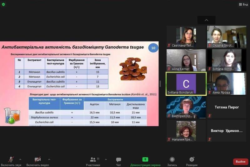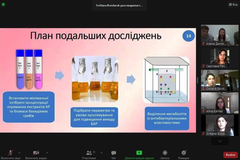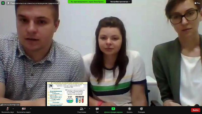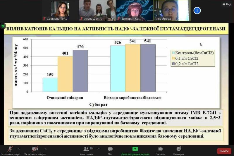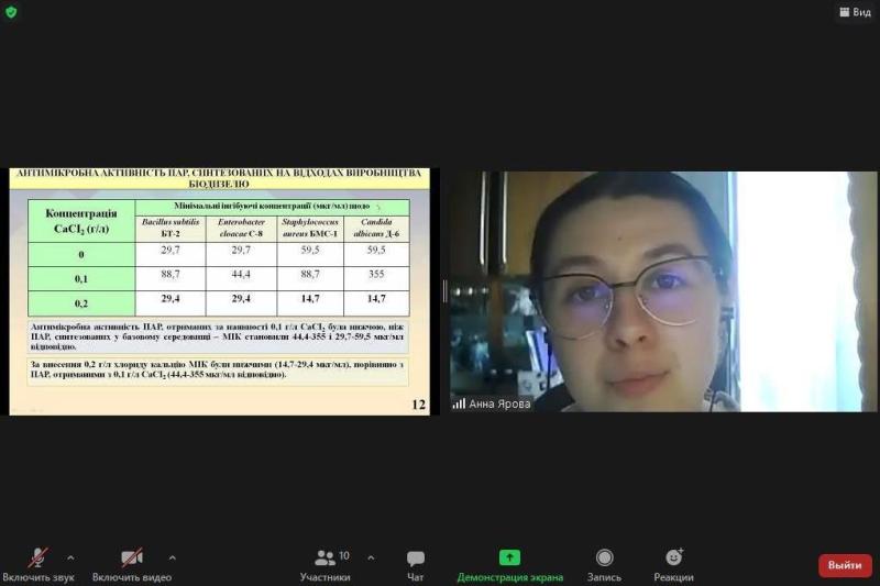 Ганна Ярова презентувала результати наукової роботи «Регуляція антимікробної активності поверхнево-активних речовин Acinetobacter calcoaceticus IМВ В-7241». Вона дослідила вплив одно- та двовалентних катіонів на активність НАДФ+-залежної глутаматдегідрогенази за умов росту A. calcoaceticus ІMВ B-7241 на очищеному гліцерині і відходах виробництва біодизелю з наступною відповідною модифікацією складу середовища і визначенням антимікробної активності синтезованих поверхнево-активних речовин.