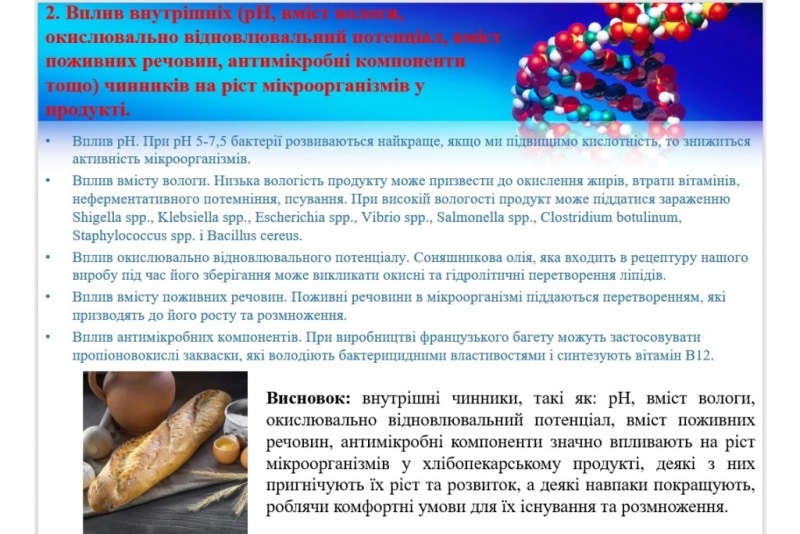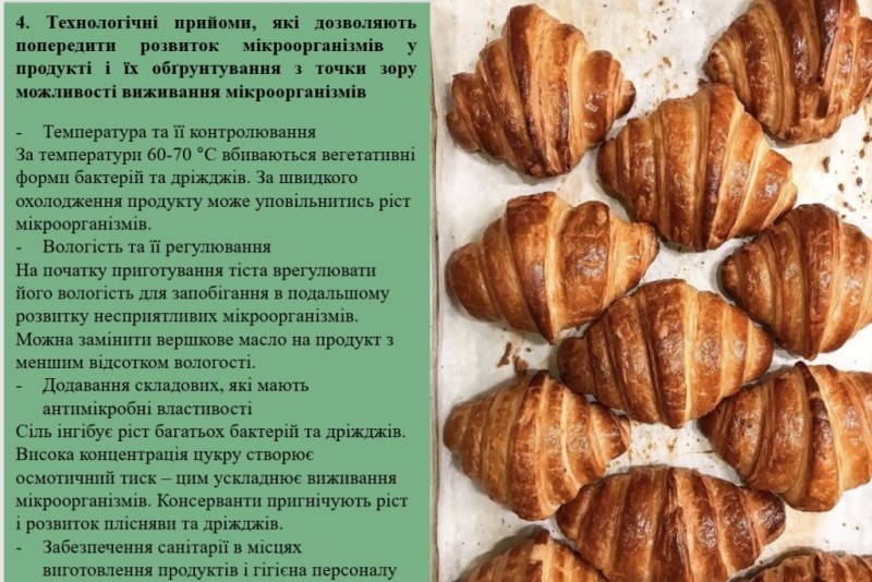 Були представлені кілька доповідей, присвячених ролі мікроорганізмів у процесі виготовлення і зберігання продуктів хлібопекарського та кондитерського виробництва, оскільки саме ця технологія є майбутньою спеціалізацією здобувачів – круасана з шоколадом (виконали здобувачки Анастасія Крушинська та Вікторія Півоварова) і багета французького (виконали здобувачки Світлана Кожем’яко та Анастасія Прокопенко).