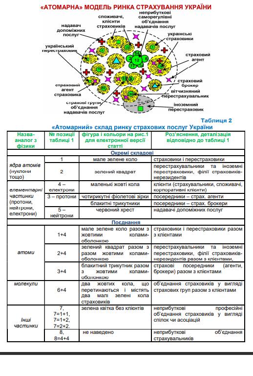 Авторами вперше запропоновано «атомну» модель страхового ринку, що складається з ядер атомів та елементарних частинок, у результаті поєднання яких формуються атоми і молекули такого ринку. Концепція передбачає регулюючий орган як центральне астрономічне тіло, подібне до Сонця, що визначає закони руху та динаміки атомів і молекул усередині ринку. Уперше запропоновано «планетарну» модель страхового ринку України, яка охоплює як учасників ринку, так і державні регулюючі суб'єкти, причому Регулятор-Сонце позиціонується як «ядро» ринку. Ця модель включає різні елементи, такі як планети, супутники, астероїди, множинні планетні системи та інші астрономічні об’єкти.