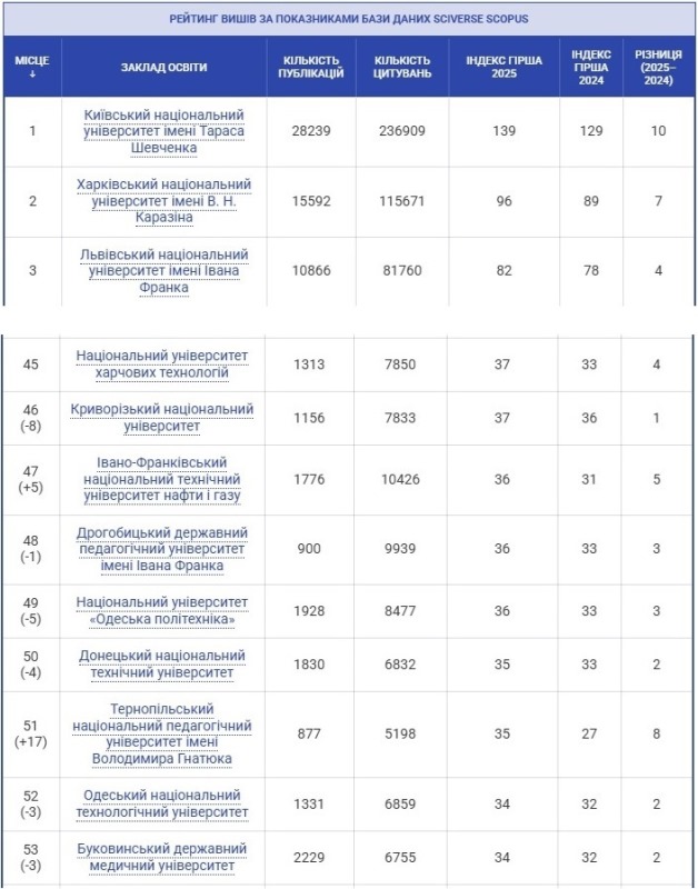 Днями портал Освіта.ua оприлюднив щорічний рейтинг закладів вищої освіти України за показниками даних наукометричної бази Scopus. У рейтинговій таблиці українські університети ранжовані за індексом Гірша – кількісним показником, що базується на числі наукових публікацій і кількості їх цитувань.