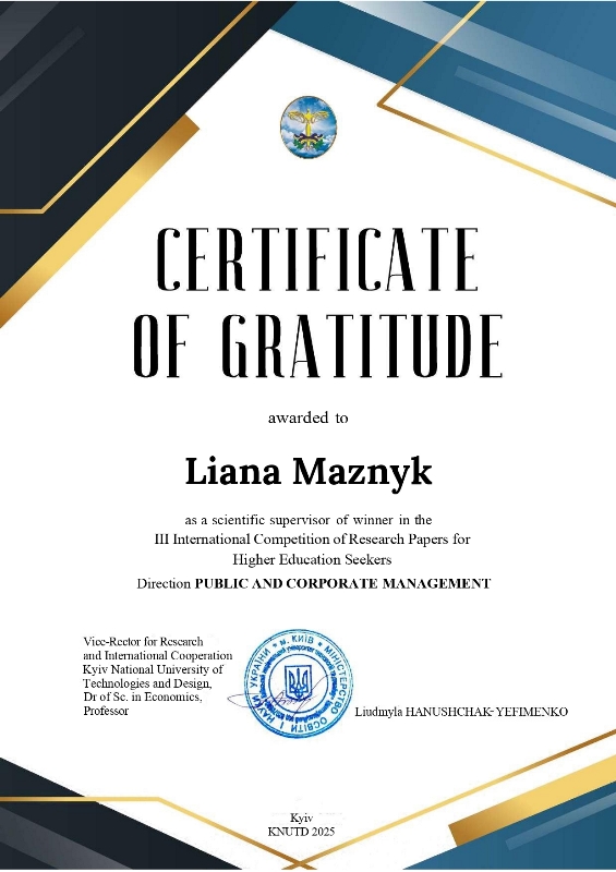 Наукова робота виконана під керівництвом гарантки магістерської освітньої програми «Менеджмент персоналу», кандидатки економічних наук, доцентки кафедри економіки праці та менеджменту Ліани Мазник.