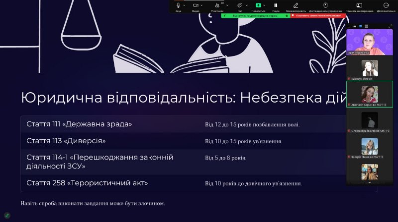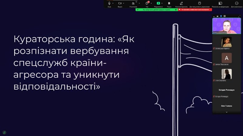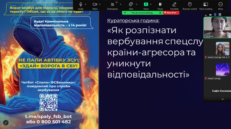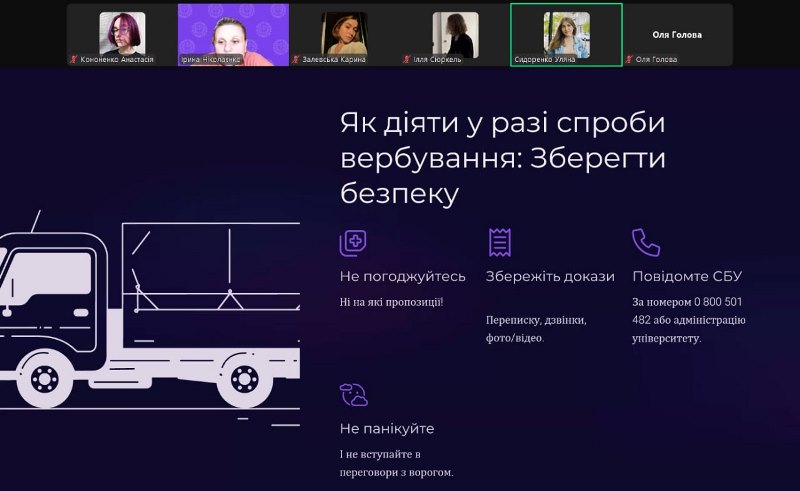 Куратори ознайомили здобувачів з методами вербування, механіками залучення до протиправних дій, формами ворожої маніпуляцій, погроз і шантажу. Акцент було зроблено на правовий аспект – наявність кримінальної відповідальності за співпрацю з ворогом (колабораційну діяльність). У формі дискусії було обговорено алгоритм дій у разі виявлення спроб вербування з боку російських спецслужб.