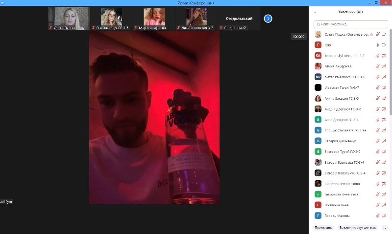 Предметом обговорення на лекції були асортимент і характеристика міцних алкогольних напоїв. Олексій розповів про власний досвід роботи з базовими напоями та з робочого місця продемонстрував їх найбільш поширені варіанти. Лекторка Ольга Пушка доповнювала матеріал лекції теоретичною складовою.