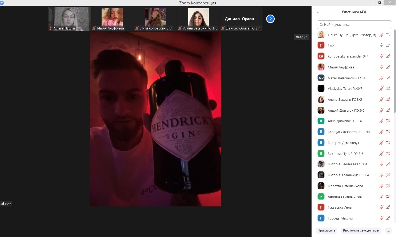 Гостьовим співлектором виступив неймовірно талановитий випускник спеціальності «Готельно-ресторанна справа» факультету готельно-ресторанного та туристичного бізнесу імені проф. В.Ф. Доценка, професіонал своєї справи, бартендер двох топових закладів ресторанного господарства м. Києва, «Golda Music Bistro» та «Broen» Олексій Гутнік.