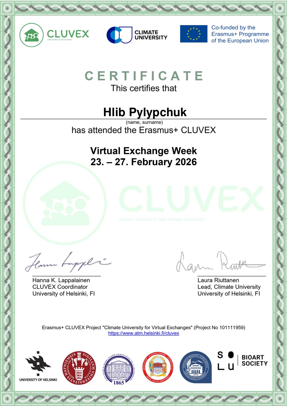 Студенти кафедри теплоенергетики та холодильної техніки взяли участь у престижній міжнародній освітній ініціативі Erasmus+ CLUVEX Virtual Exchange Week, що відбулася 23-27 лютого 2026 року. Цей проєкт, організований у партнерстві з Гельсінським університетом та ініціативою ClimateUniversity, спрямований на розвиток екологічної свідомості та зміцнення міжнародних наукових зв’язків.