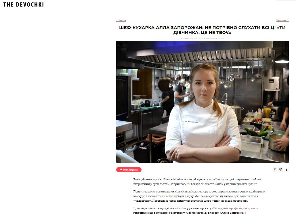 Про стереотипи щодо жінок на кухні ресторану з незалежним жіночим виданням www.thedevochki.com поділилася магістрантка факультету готельно-ресторанного та туристичного бізнесу Алла Запорожан, яка успішно поєднує навчання з роботою за фахом.