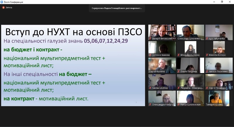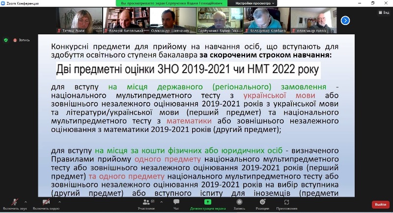 Про особливості вступної кампанії 2022 року розповів відповідальний секретар приймальної комісії, доцент Вадим Серпученко. Фахівець окреслив відмінності цьогорічної вступної кампанії, зокрема йшлося про вступ на основі національного мультипредметного тесту та мотиваційного листа усіх категорій вступників, розрахунок конкурсного балу, дати та етапи вступної кампанії. Багато новацій у вступі-2022 буде для випускників коледжів, що вступатимуть на освітній ступінь «бакалавр» на основі здобутого ступеня «молодший спеціаліст». Зокрема, вони не задаватимуть фахові вступні випробування в університеті, а вступатимуть за результатами НМТ 2022 року або двох предметних оцінок ЗНО 2019-2021 років. Також для цієї категорії вступників вперше застосовуватиметься принцип «місце йде за вступником».
