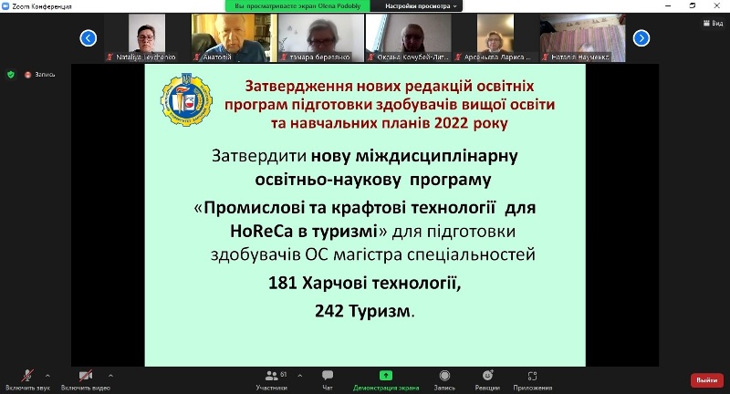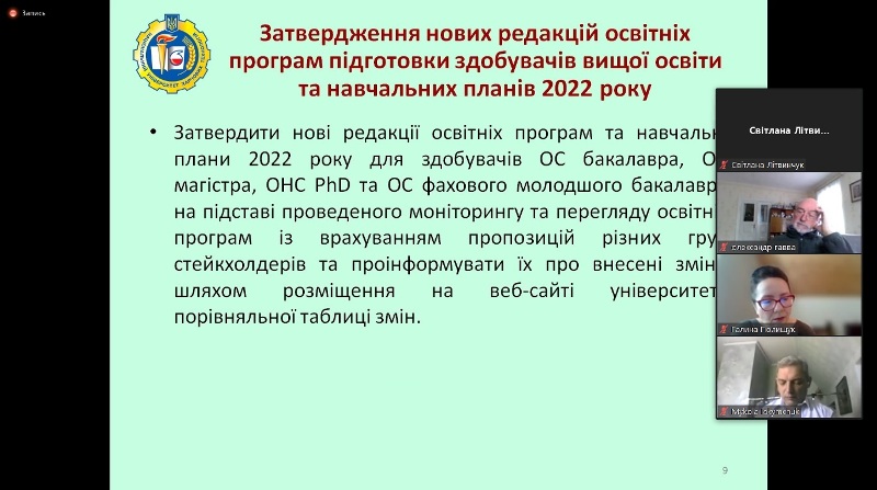 За результатами обговорення вчена рада прийняла рішення затвердити нові редакції освітніх програм та навчальні плани 2022 року для здобувачів освітнього ступеня «бакалавр», освітнього ступеня «магістр», освітньо-наукового ступеня «доктор філософії» та освітнього ступеня «фаховий молодший бакалавр». Крім того, було ухвалено закрити освітньо-професійну програму підготовки здобувачів освітнього ступеня «магістр» «Енергетичний менеджмент» спеціальності 141 Електроенергетика, електротехніка та електромеханіка на підставі проведеного локального моніторингу освітніх програм, наявності експертного рішення НМК інституту та рішення НМР університету; затвердити нову міждисциплінарну освітньо-наукову програму «Промислові та крафтові технології для HоRеCа в туризмі» для підготовки здобувачів освітнього-ступеня «магістр» спеціальностей 181 Харчові технології та 242 Туризм; після врахування рекомендацій та внесення змін, запропонованих НМК Навчально-наукового інституту економіки і управління, затвердити освітньо-професійну програму «Цифрові бізнес-технології в підприємництві» для підготовки здобувачів освітнього ступеня «бакалавр» спеціальності 076 Підприємництво, торгівля та біржова діяльність.