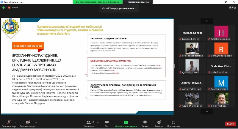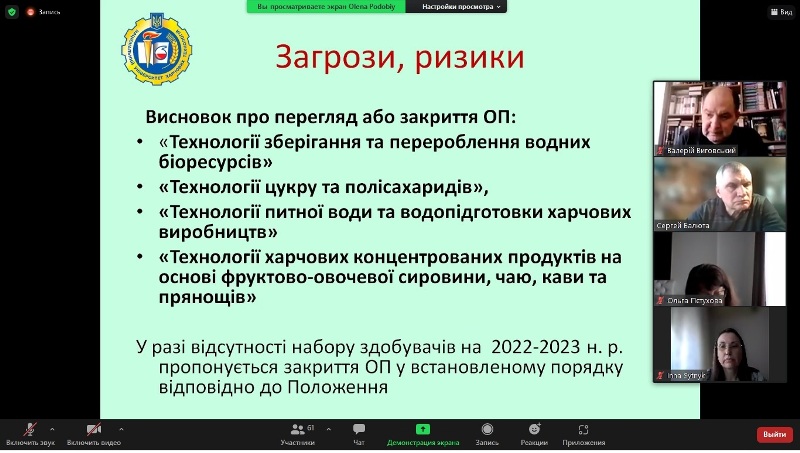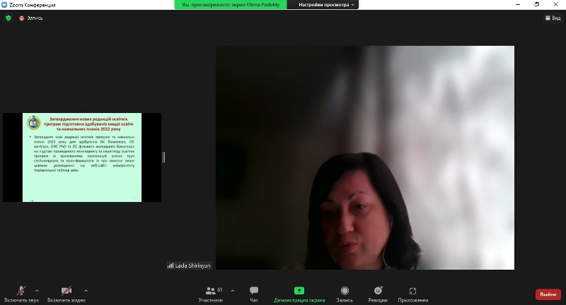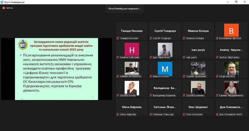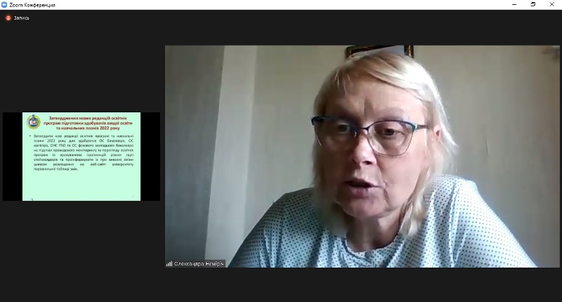 Далі у виступі Олени Подобій йшлося про затвердження нових редакцій освітніх програм підготовки здобувачів вищої освіти та навчальних планів 2022 року. На підставі проведеного моніторингу та періодичного перегляду освітніх програм із врахуванням рекомендацій різних груп стейкхолдерів були надані пропозиції щодо затвердження освітніх програм, закриття однієї магістерської програми та відкриття двох нових освітніх програм – магістерської і бакалаврської. Також директорка Центру назвала чотири магістерські програми, що перебувають у групі ризику через гранично низьку кількість зацікавлених здобувачів освіти. Крім того, вона довела до відома присутніх, що освітні програми двох відокремлених структурних підрозділів – Свалявського технічного фахового коледжу НУХТ і Кам’янець-Подільського фахового коледжу харчової промисловості НУХТ також пройшли всі етапи обговорення та погодження й можуть бути затверджені.