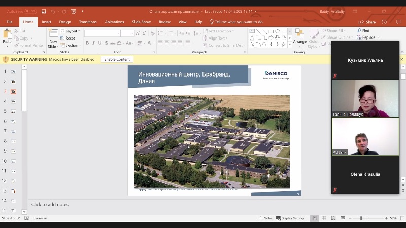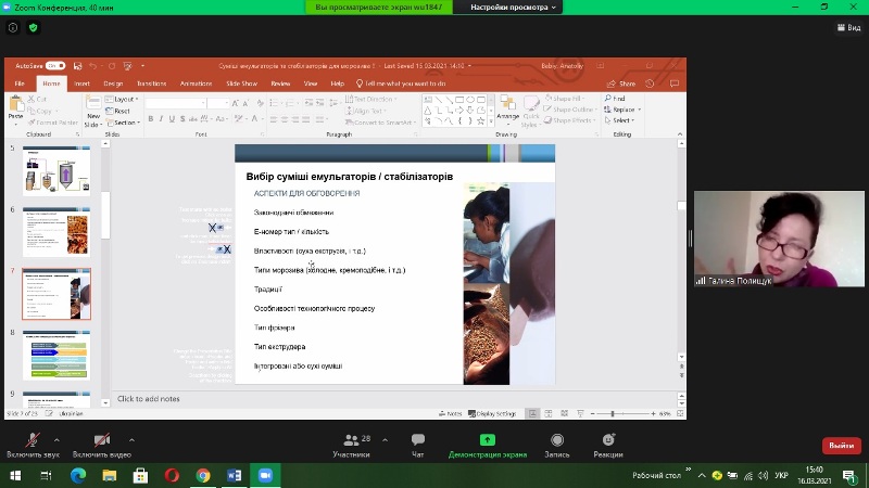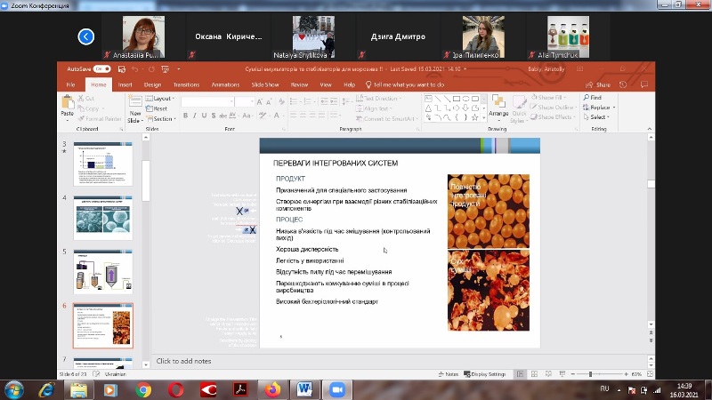 Здобувачі освіти ознайомилися зі складом та особливостями застосування інноваційних інгредієнтів для різних галузей харчової промисловості. Лектор детально зупинився на питаннях використання інновацій у молочній промисловості, зокрема у технологіях ферментованих молочних продуктів, сиру кисломолочного, молочних продуктів десертного призначення.  Особлива увага була приділена способам одержання, зберігання і застосування ліофілізованих і заморожених заквашувальних препаратів, замінників цукру для продуктів спеціального призначення, стабілізаторів, емульгаторів, кріопротекторів, пробіотиків і пребіотиків.
