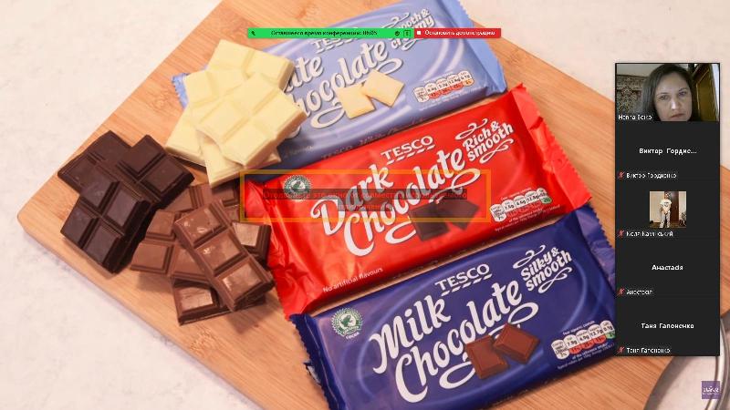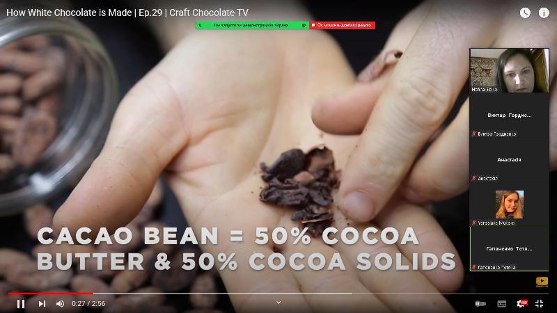 На кафедрі іноземних мов професійного спрямування відбулося чергове засідання Movie Club зі студентами першого курсу Навчально-наукового інституту харчових технологій. Модератором зустрічі була старша викладачка кафедри Ганна Бойко. На платформі Zoom була організована відеоконференція з метою перегляду фільмів «Where Does Chocolate Come and How is it Made» та «How white chocolate is made?».
