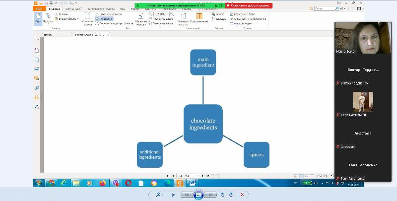 Перед початком перегляду здобувачі освіти ознайомились із новими лексичними одиницями, пов’язаними з технологією виробництва шоколаду. Під час перегляду фільмів вони багато дізналися про особливості виготовлення різних видів шоколаду: чорного, молочного, білого та про спеції, які до них додають. Після перегляду фільмів студенти заповнили інтелект-карти та обговорили особливості виготовлення  та види шоколаду відповідно до вмісту какао.