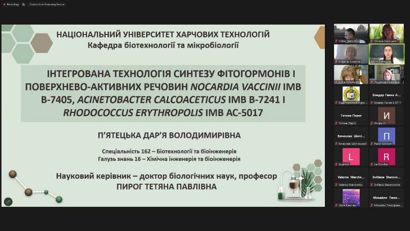 На кафедрі біотехнології і мікробіології відбувся черговий захист дисертації на здобуття ступеня доктора філософії за спеціальністю 162 «Біотехнології та біоінженерія». Свою роботу мала честь представляти здобувачка кафедри Дар’я П’ятецька.