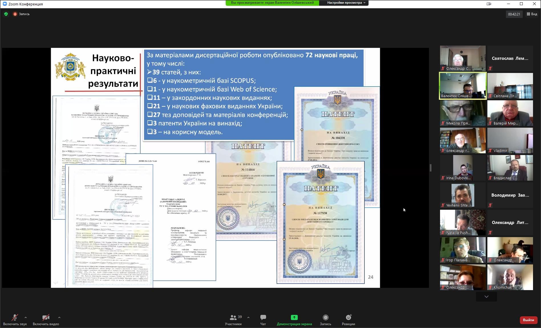 Члени спеціалізованої вченої ради, зважаючи на ґрунтовне представлення дисертаційної роботи й впевнені чіткі та аргументовані відповіді здобувача на усі питання присутніх, також підтримали науковця й одностайно проголосували за присудження Валентину Олішевському наукового ступеня доктора технічних наук зі спеціальності 05.18.12 «Процеси та обладнання харчових, мікробіологічних та фармацевтичних виробництв»
