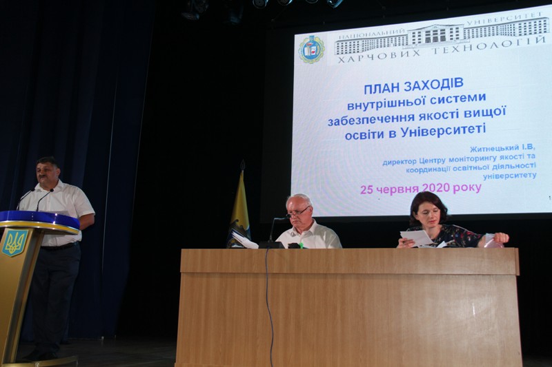 З питань порядку денного висловилися, надали свої запитання, зауваження та пропозиції до проєктів рішень в.о. ректора Володимир Яровий, проректори Лариса Арсеньєва і Олександр Бессараб, завідувачі кафедр Володимир Ковбаса і Анатолій Куц, професор кафедри харчової хімії Сергій Шульга.