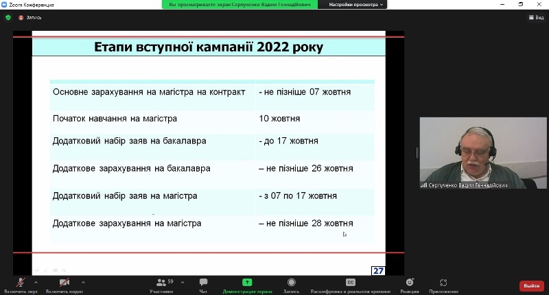 Про хід вступної кампанії 2022 року доповів відповідальний секретар приймальної комісії Вадим Серпученко. Фахівець розповів про особливості цьогорічної вступної кампанії і що було змінено в умовах вступу у зв’язку з воєнним станом, про підготовку університету до проведення вступної кампанії, навів обсяги державного замовлення, проінформував про переведення вступників пільгових категорій на вакантні місця, проаналізував статистику по поданих заявах і документах по усіх категоріях вступників і всіх формах навчання.