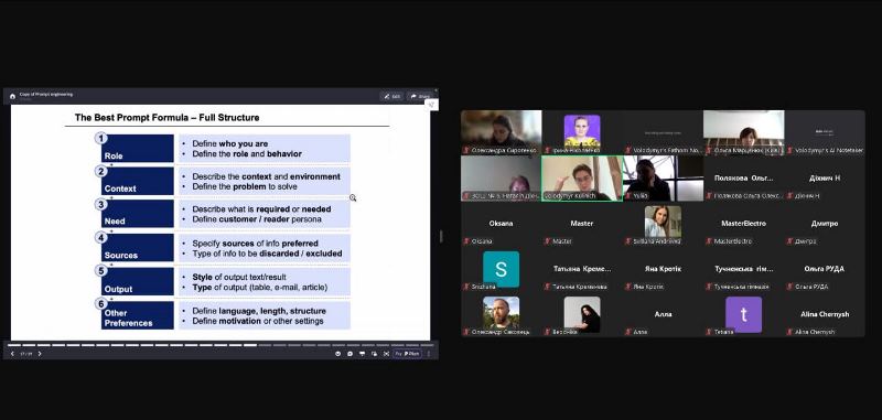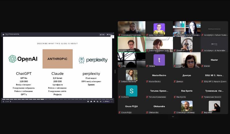 Під час навчання учасники дізналися, як ефективно використовувати штучний інтелект у підготовці до занять, зокрема створювати правильні запити для ШІ, швидко генерувати домашні завдання та презентації.