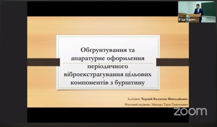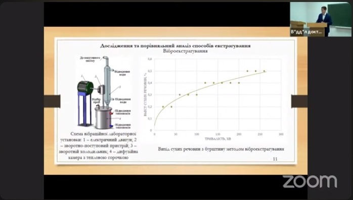 Наприкінці року дисертаційне дослідження «Обґрунтування та апаратурне оформлення періодичного віброекстрагування цільових компонентів з бурштину» у галузі знань 18 «Виробництво та технології» за спеціальністю 181 «Харчові технології» успішно захистив ще один здобувач наукового ступеня «Доктор філософії» Валентин Чорний. Дисертація виконана під науковим керівництвом к.т.н., доцента кафедри процесів і апаратів харчових виробництв Тараса Мисюри у межах пріоритетного напряму науково-дослідної роботи «Інтенсифікація технологічних процесів в харчовій і мікробіологічній промисловості».