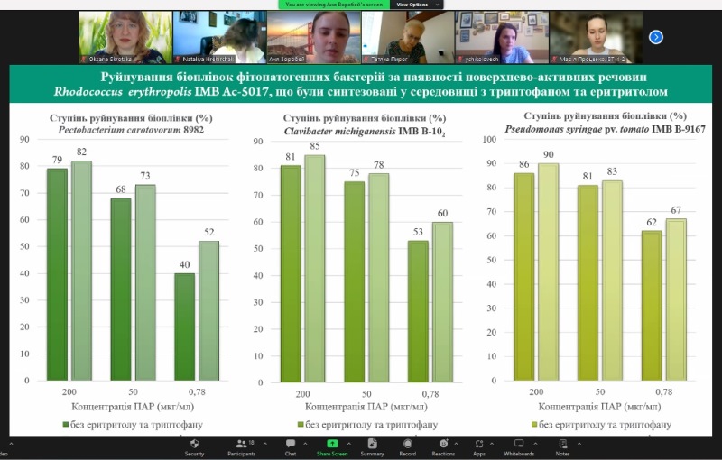 ІІІ місце – Марія Проценко (група БТ-4-2) з роботою «Біотрансформація селеніту у наночастинки та їх подальше використання для біоремедіації довкілля та у вигляді БАД» і Дар’я Благодир (група ПФБ-1-1М) з роботою «Бактерії роду Enterobacter як фактор регуляції антиадгезивної активності поверхнево-активних речовин Acinetobacter calcoaceticus IМВ В-7241».