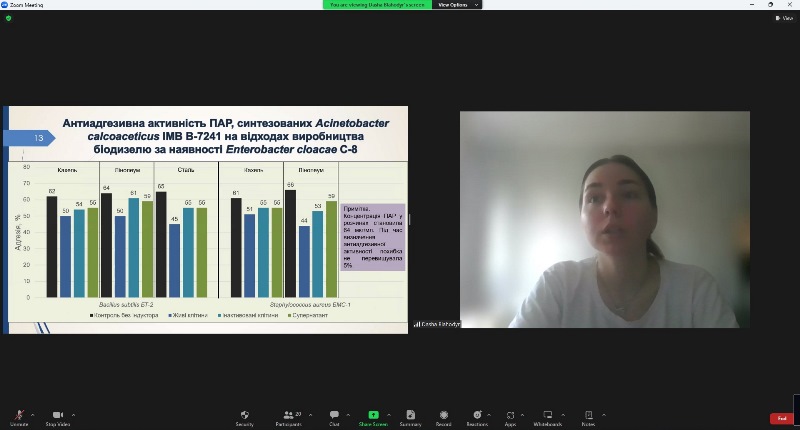 ІІ місце – Марія Дзюба (група ПФБ-1-1М) з роботою «Роль поверхнево-активних речовин та інших метаболітів Acinetobacter calcoaceticus IМВ В-7241 у біосинтезі наночастинок срібла з антибактеріальною дією» та Анастасія Охмакевич (група ПФБ-1-1М) з роботою «Деструкція комбінованих біоплівок за дії комплексу ефірних олій з поверхнево-активними речовинами Rhodococcus erythropolis IМВ Ac-5017, синтезованими за наявності дріжджів роду Saccharomyces»;