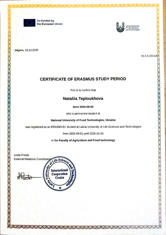 Практичним прикладом ефективного застосування механізмів трансферу кредитів є участь здобувачки освітньо-професійної програми «Технології харчування» Наталії Теплоухової (група ХЧ-4-2) у програмі академічної мобільності Erasmus+ у Latvia University of Life Sciences and Technologies (м. Єлгава, Латвія). За результатами навчання у партнерському закладі вона отримала офіційні документи, що підтверджують освітні досягнення, зокрема Transcript of Records та Certificate of Erasmus Study Period.