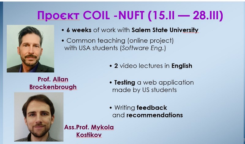 Реалізатором цього проєкту в університеті був кандидат технічних наук, доцент кафедри інформаційних технологій, штучного інтелекту і кібербезпеки Микола Костіков. У співпраці з американським професором Allan Brockenbrough з державного університету міста Салем, штат Массачусетс (Salem State University), викладачі провели дві відеолекції за темою «Крос-платформне програмування». Протягом шести тижнів навчання, якому передувало чотири тижні обговорень і складання планів семінарів і завдань, COIL-колеги разом зі студентами з двох континентів провели тестування веб-платформ, проаналізували результати та розробили рекомендації щодо їх застосування.