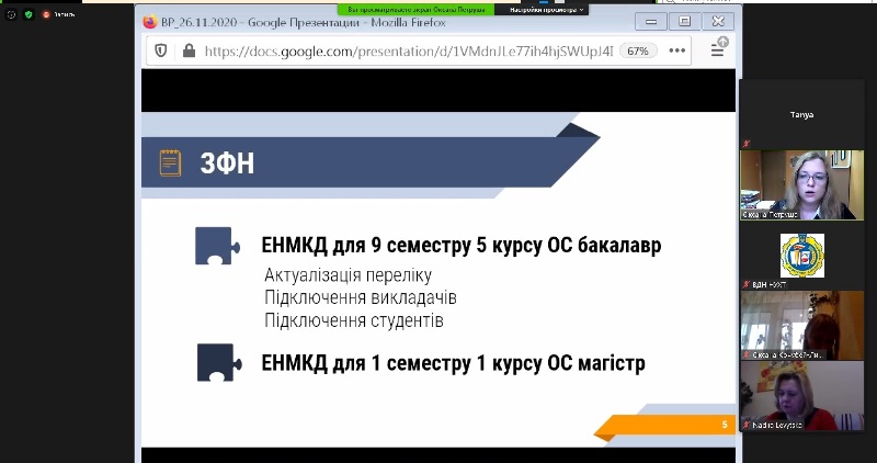 Далі розглянули не менш актуальне питання – про стан та оновлення електронних навчально-методичних комплексів дисциплін (ЕНМКД) на платформі дистанційного навчання. Доповідала начальниця відділу дистанційного навчання Оксана Петруша.