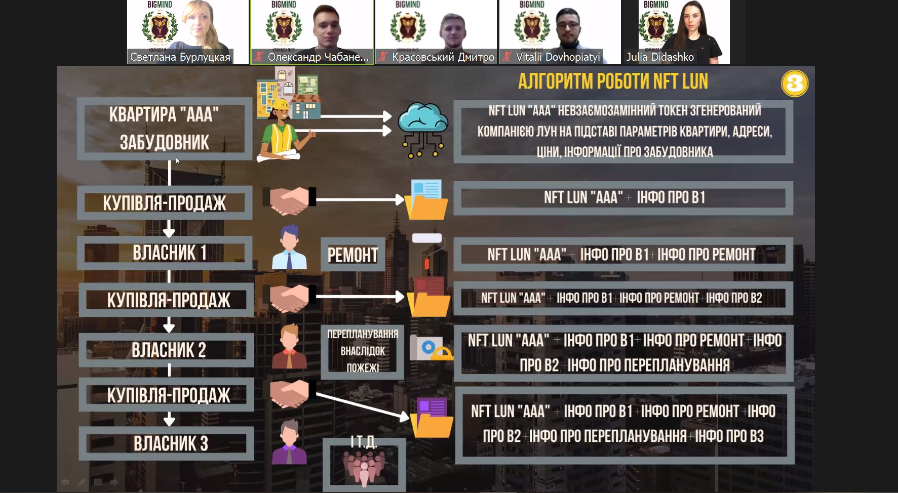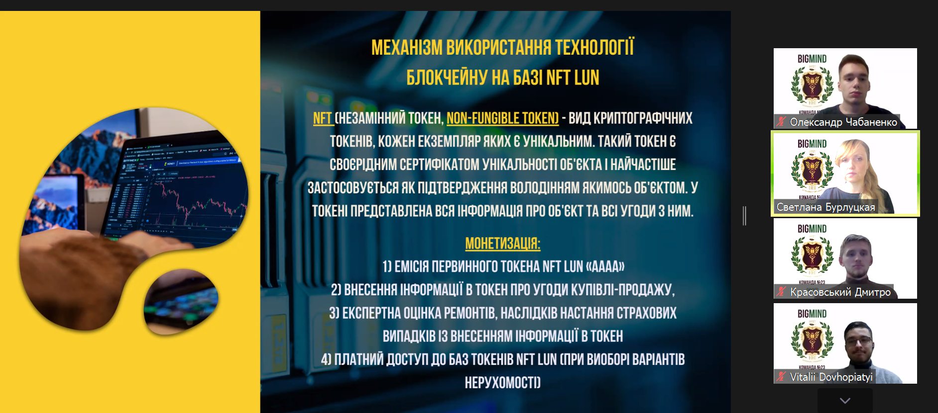 Магістранти освітньо-професійної програми «Менеджмент організацій і адміністрування» під керівництвом професорки кафедри економіки праці та менеджменту, гарантки програми Світлани Бурлуцької взяли участь у Всеукраїнському конкурсі «LoNG-2021» (Look of New Generation/Погляд нового покоління) «Блокчейн приходить в Україну», що тривав з 1 жовтня по 14 грудня 2021. Наша команда «BigMind» виборола друге місце серед 40 команд-учасниць різних університетів України. Переможці та наставниця отримали дипломи і матеріальний приз.