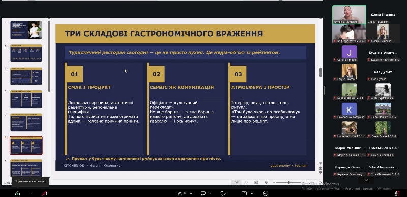 Лекція «Як гастрономія впливає на привабливість міста чи країни для туристів» відбулася в межах серії KITCHEN OS і була інтегрована у навчальну дисципліну «Основи гостинності» для здобувачів першого курсу спеціальності «Готельно-ресторанна справа та кейтеринг», але до неї активно долучилися й студенти старших курсів і викладачі факультету.