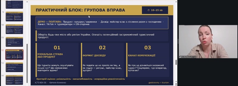 Лекція мала практичний вимір: студенти працювали над кейсом Полтави, створюючи власні гастротуристичні продукти, визначаючи унікальність страви, формат досвіду та канали комунікації для іноземного гостя.