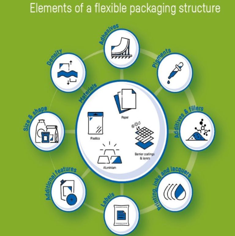 - зазвичай гнучка полімерна упаковка складається з кількох шарів: на зовнішній шар наноситься поліграфічне оформлення, середній має бар’єрні властивості для захисту пакованого продукту, а внутрішній шар слугує для зварювання при формуванні пакетів;