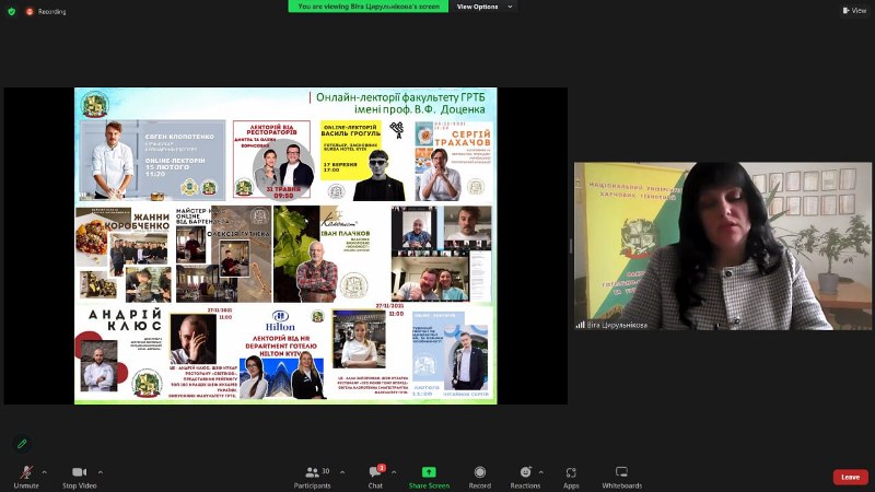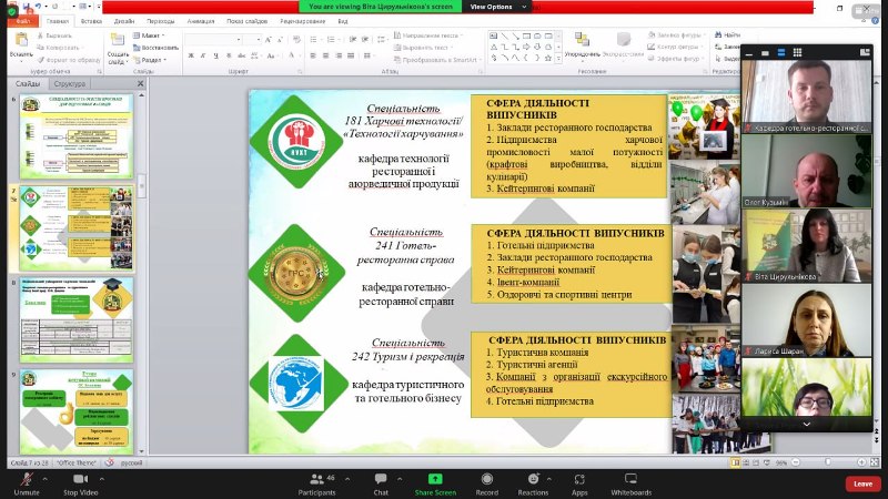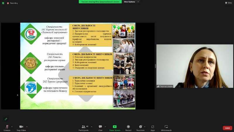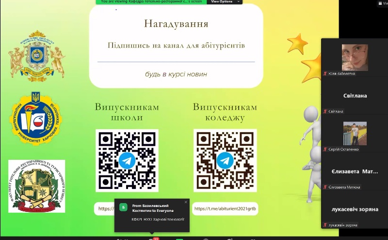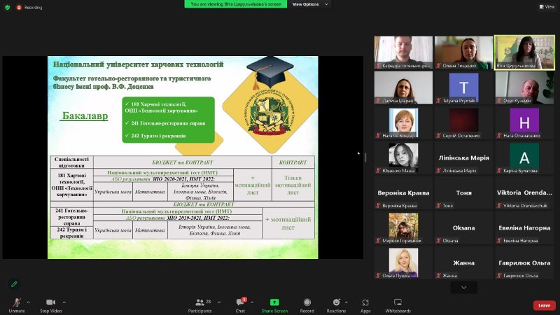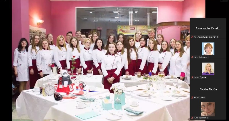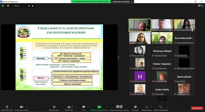 У онлайн-просторі майбутніх вступників зустрічали деканка факультету Віта Цирульнікова, завідувачка кафедри готельно-ресторанної справи Лариса Шаран, заступниця завідувачки кафедри туристичного та готельного бізнесу Тетяна Примак, гарант освітньо-професійної програми «Технології харчування» бакалаврського рівня Олег Кузьмін, заступниця декана по роботі зі студентами Олена Тищенко, відповідальний за профорієнтаційну роботу кафедри готельно-ресторанної справи Артем Ущаповський.