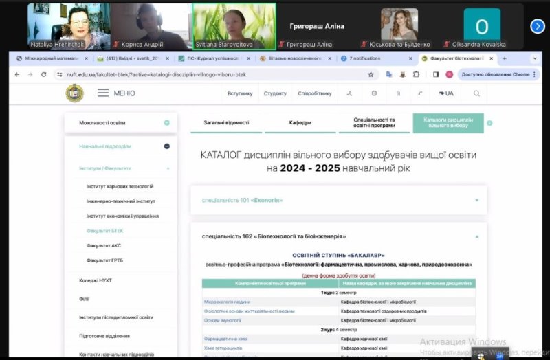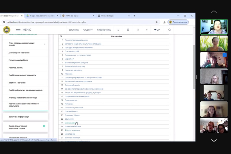 Світлана Старовойтова ґрунтовно висвітлила процедуру вибору дисциплін відповідно до Положення про порядок реалізації здобувачами вищої освіти права на вільний вибір навчальних дисциплін, звернула увагу на терміни вибору та розповіла, які саме дисципліни пропонуються. Гарантка наголосила на сукупному обсязі обов’язкової та вибіркової складових за освітньою програмою та переліку дисциплін, що пропонуються здобувачам для вибору на наступний семестр. Здобувачі ознайомилися із загальноуніверситетським каталогом вибіркових дисциплін, каталогом галузі знань 16 «Хімічна та біоінженерія» і каталогом освітньо-професійної програми.