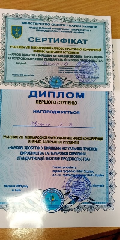 17-18 квітня у Національному університеті біоресурсів і природокористування України працювала VIII Міжнародна науково-практична конференція вчених, аспірантів і студентів «Наукові здобутки у вирішенні актуальних проблем виробництва та переробки сировини, стандартизації і безпеки продовольства», де наш університет гідно представили молоді доповідачі-студенти Андрій Буров і Ірина Івченко (наукові керівники – доцент кафедри технології жирів, хімічних технологій харчових добавок та косметичних засобів Олена Подобій і доцент кафедри машин і апаратів харчових та фармацевтичних виробництв Ігор Житнецький).