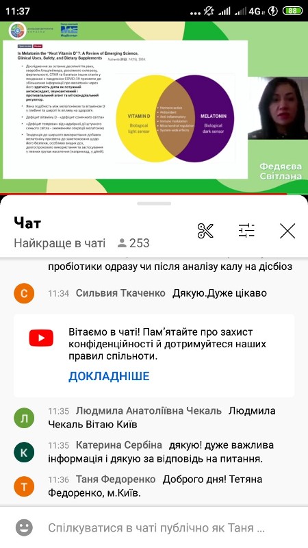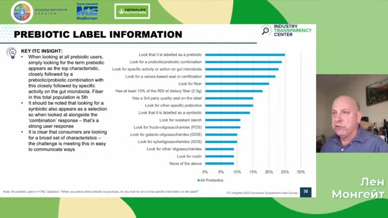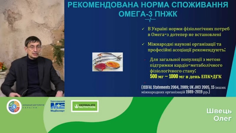 Іноземні колеги представили доповіді: Елана Наткер з Гаррогейт (Великобританія) «ЕПК + ДГК Омега-3: останні наукові дані», Лен Монгейт із Чикаго (США) «До кращого розуміння пребіотиків і тих, кому вони потрібні»; з побажаннями продовжувати актуальні наукові дослідження в непростий військовий час звернувся до учасників заходу генеральний директор Міжнародного альянсу асоціацій дієтичних добавок Сімон Петтманн (Лондон, Великобританія).