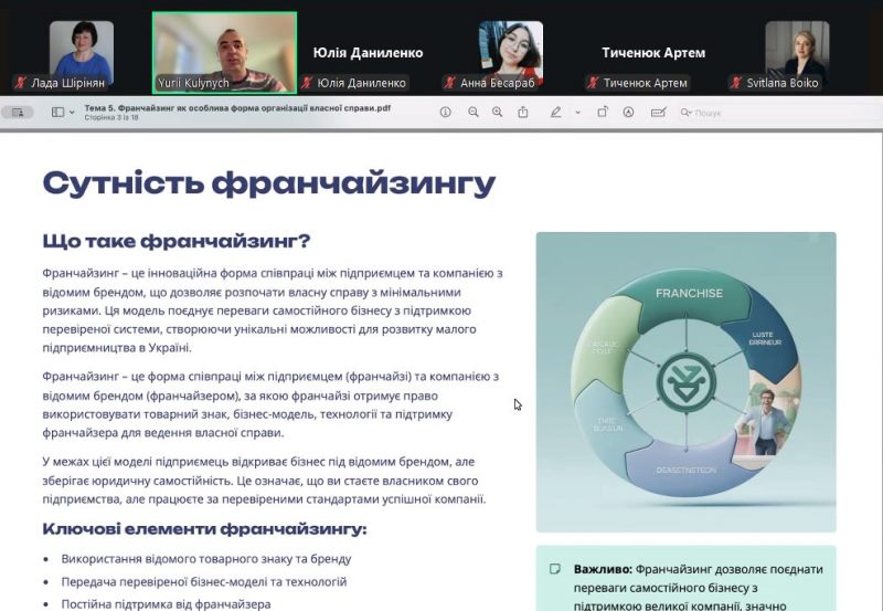 Також викладач навів приклади успішних франшиз в Україні у сфері харчування, роздрібної торгівлі та послуг. Лектор зупинився як на теоретичних основах, так і на практичних кейсах. Особливої уваги заслуговують приклади українських франшиз, які продемонстрували життєздатність цієї моделі навіть в умовах сучасних викликів.