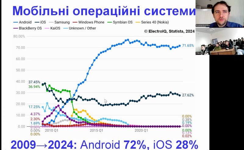 Спочатку розглянули сучасні мобільні операційні системи та їхнє поширення в різних країнах Європи та світу. Також обговорили можливості кар'єрного шляху в цій сфері та актуальні технології, що дозволяють розробляти додатки.