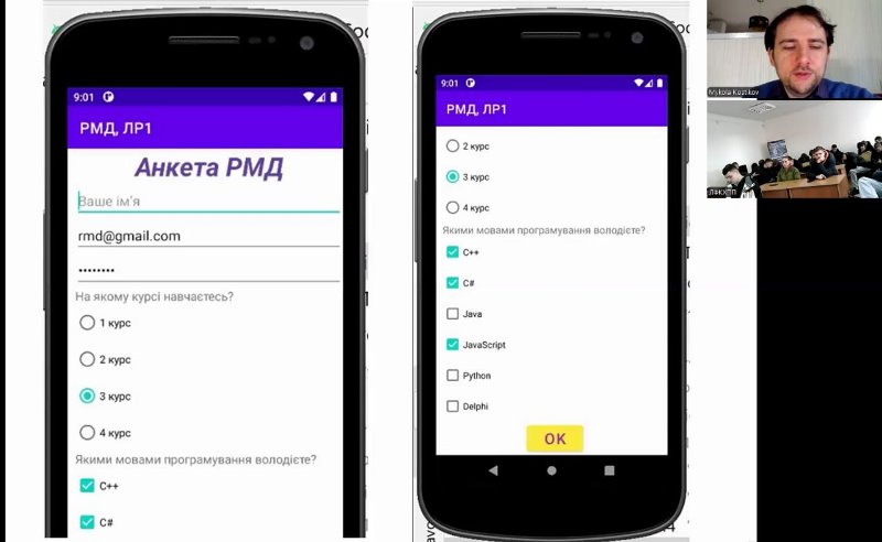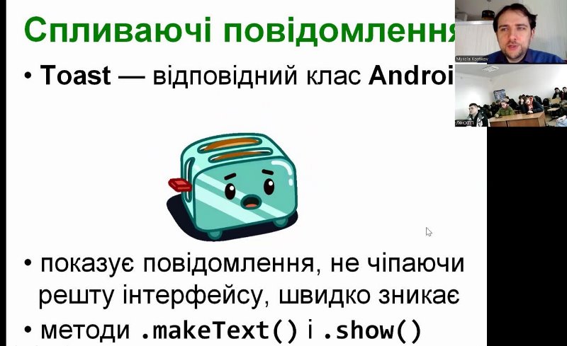 Далі лектор розповів докладніше про Android OS і мову Kotlin, яка є нині пріоритетною при створенні мобільних застосунків для цієї системи. Крім того, було показано інтерфейс середовища Android Studio та процес створення власного додатку з нуля, налаштування його дизайну та реакції на дії користувачів.