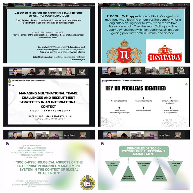 Тематика магістерських робіт відзначалася високою актуальністю та суспільною значущістю в умовах воєнного стану в Україні. Дослідження були спрямовані на вирішення сучасних проблем менеджменту персоналу, зокрема адаптації та реінтеграції ветеранів війни у трудові колективи; розвитку соціально-трудових відносин в умовах воєнного стану; дослідження соціально-психологічних аспектів менеджменту персоналу, зокрема мотивації, лідерства, командної взаємодії, стресостійкості та психологічної підтримки працівників; удосконалення систем управління персоналом і HR-процесів; застосування сучасних цифрових управлінських інструментів у сфері HR.