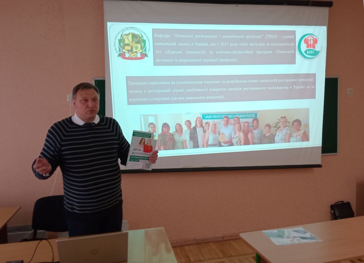 14 травня 2024 року доцентка кафедри технології ресторанної і аюрведичної продукції Ірина Корецька та старший викладач Володимир Польовик провели профорієнтаційну зустріч з 9-11-ми класами спеціалізованої школи №130м. Києва.