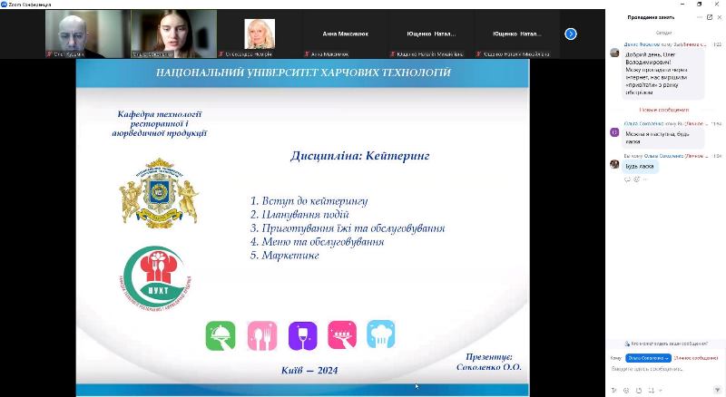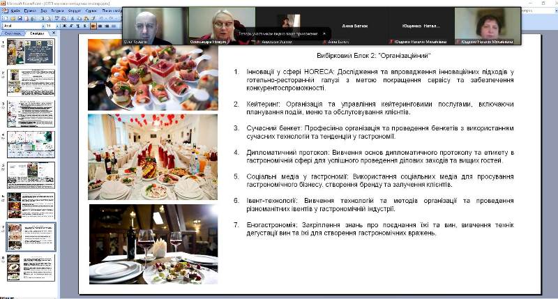 До обговорення були залучені викладачі кафедри, серед яких гаранти трьох освітніх програм – професорка Олександра Нєміріч, гарантка магістерської освітньої програми «Технології в ресторанному господарстві», професор Олег Кузьмін, гарант бакалаврської освітньої програми «Технології харчування» та доцентка Наталія Ющенко, гаранта магістерської освітньої програми «Технології дієтичної та аюрведичної харчової продукції». Гаранти стимулювали зацікавленість здобувачів щодо розгляду каталогу вибіркових дисциплін із переліку та блоків і виступили як наставники.