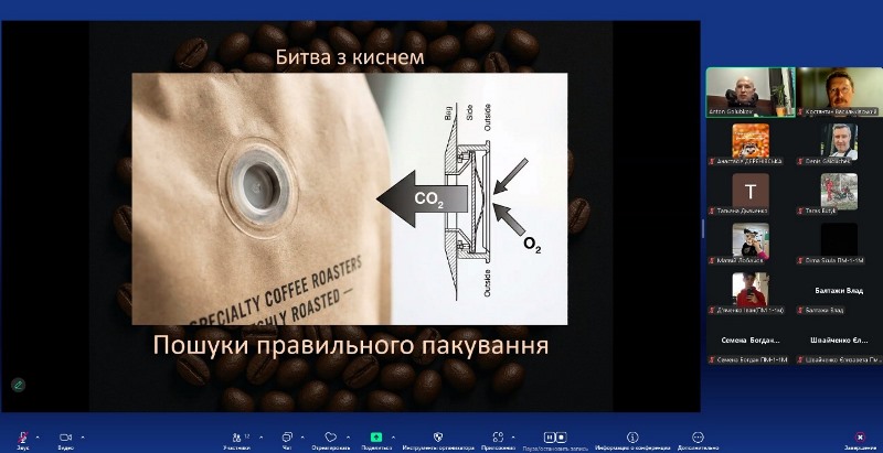 Відзначили важливість використання в упаковці інженерного рішення – одностороннього клапана дегазації, який випускає CO₂, але не впускає O₂, запобігаючи здуттю пакета й окисленню ліпідів. Лектор також показав роль азотування та модифікованої атмосфери, які преміальні бренди застосовують для стабілізації смаку й подовження терміну зберігання продукту.