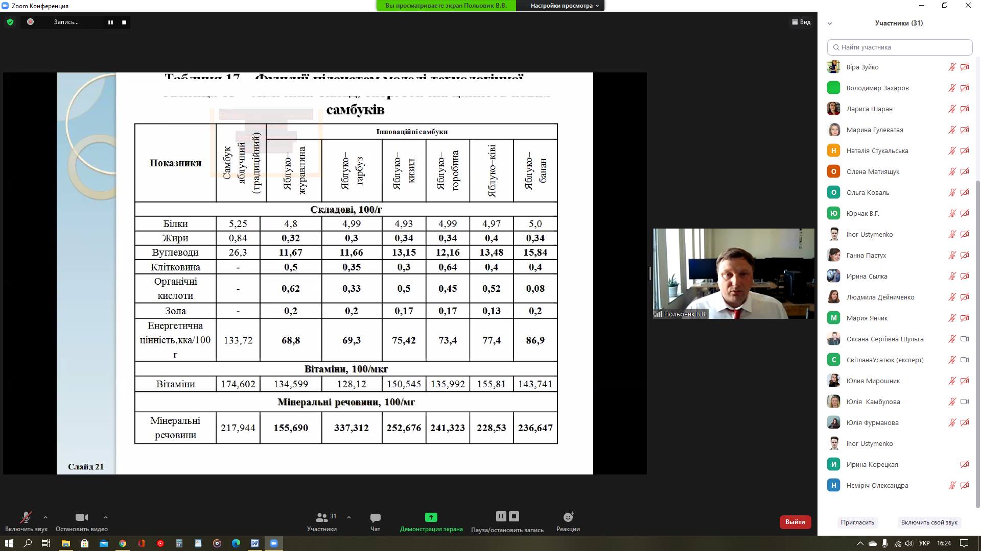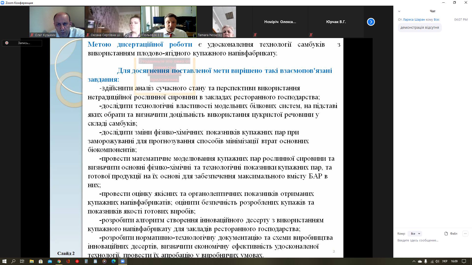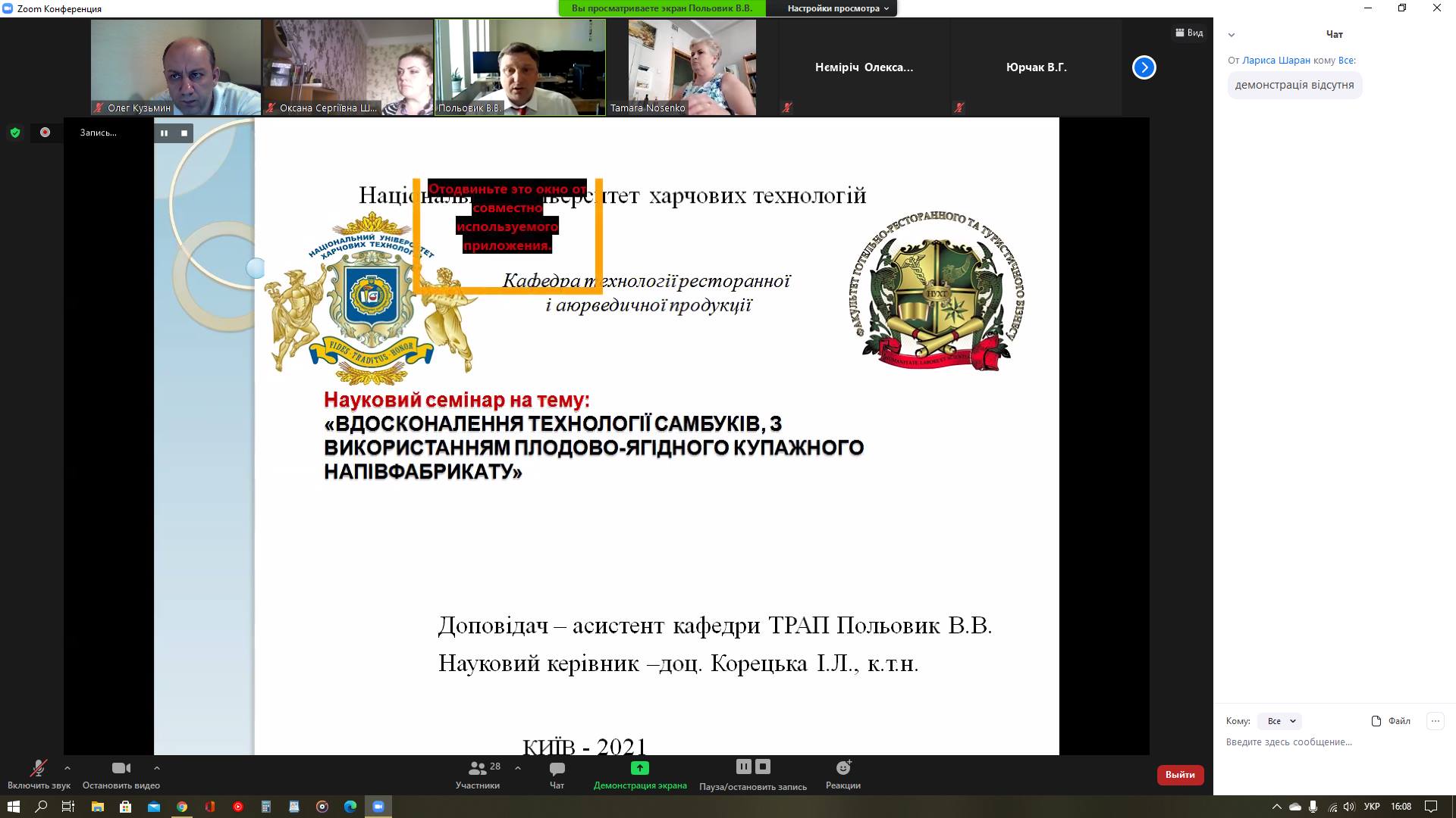 На кафедрі технології ресторанної і аюрведичної продукції в онлайн-режимі відбувся міжкафедральний науковий семінар «Вдосконалення технології самбуків з використанням плодово-ягідного купажного напівфабрикату», на якому асистент кафедри Володимир Польовик представив результати своїх досліджень, за якими готується до захисту дисертації на здобуття наукового ступеня кандидата технічних наук за спеціальністю 05.18.16 – Технологія харчової продукції. Наукова керівниця – к.т.н, доцентка кафедри технології ресторанної і аюрведичної продукції Ірина Корецька.