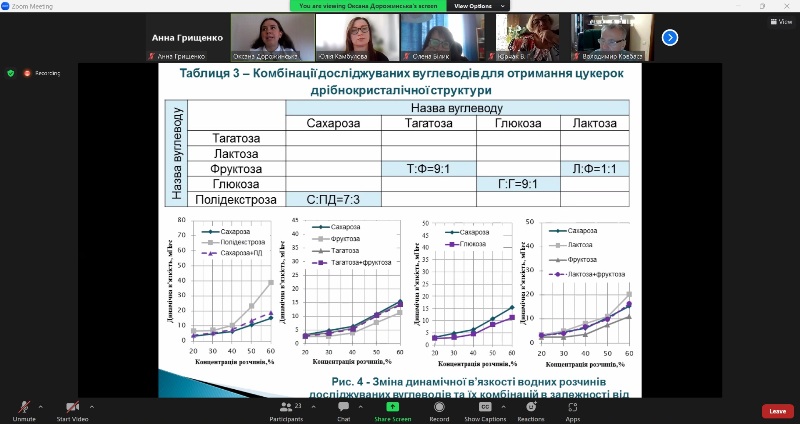До засідання долучились фахівці Інституту продовольчих ресурсів – завідувачка відділу технологій хліба та біотрансформації зернових продуктів, докторка технічних наук Оксана Науменко та заступниця завідувача відділу технології цукру, цукровмісних продуктів та інгредієнтів, докторка технічних наук Інга Кузнєцова, а також завідувачка кафедри готельно-ресторанної справи Лариса Шаран, викладачі кафедр технології ресторанної та аюрведичної продукції та готельно-ресторанної справи нашого університету, аспіранти кафедри технології хлібопекарських і кондитерських виробів.