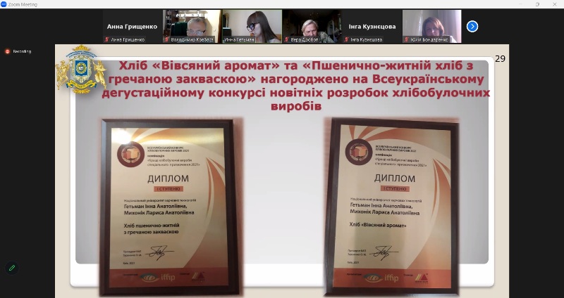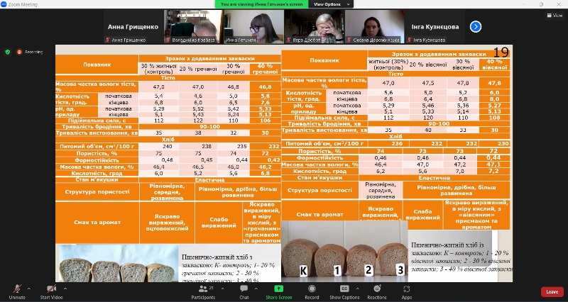 Здобувачка освітньо-наукового ступеня Інна Гетьман представила роботу «Удосконалення технології хліба з використанням заквасок з борошна круп’яних культур», яку вона виконала під керівництвом доцентки кафедри технології хлібопекарських і кондитерських виробів Лариси Михонік. Рецензували роботу професорка кафедри готельно-ресторанної справи Тетяна Сильчук і доцентка кафедри технології хлібопекарських і кондитерських виробів Наталія Фалендиш.