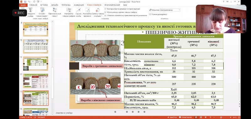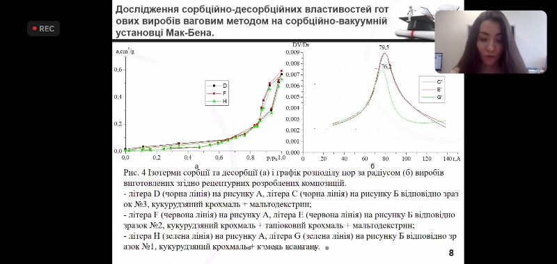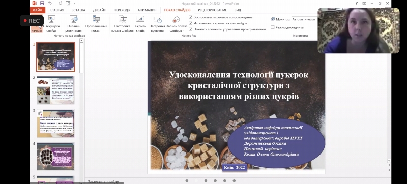 Презентації результатів наукових досліджень представили Оксана Дорожинська на тему «Удосконалення технології цукерок кристалічної структури з використанням різних цукрі», Марія Грицевіч на тему «Дослідження реологічних та структурно-механічних показників тістових мас та готових виробів», Інна Гетьман на тему «Використання заквасок спонтанного бродіння з борошна круп’яних культур в різних видах хлібних виробів».