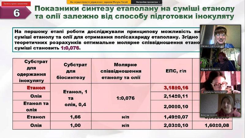 Марина Ярош – переможниця Всеукраїнського конкурсу студентських наукових робіт зі спеціальності «Екологія». Вона досліджує можливість біоконверсії суміші відпрацьованої соняшникової олії з іншими субстратами в мікробний екзополісахарид етаполану. Також вивчає особливості синтезу етаполану на суміші енергетично надлишкових субстратів.
